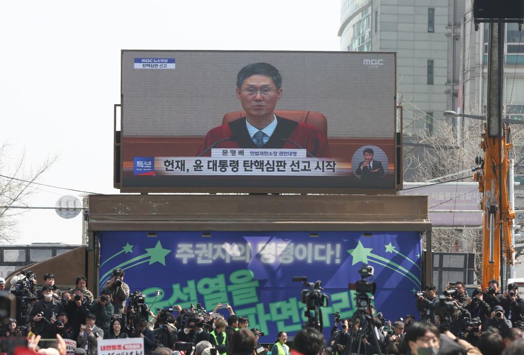 4月4日,民眾在韓國首都首爾的韓國憲法法院附近觀看尹錫悅彈劾案宣判過程的電視直播。新華社記者姚琪琳攝