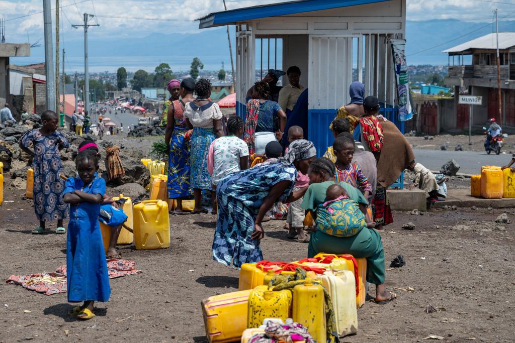 5月6日,在剛果(金)東部北基伍省戈馬市郊,流離失所者在原營地附近的一處取水點等待取水。新華社記者鄭揚子攝