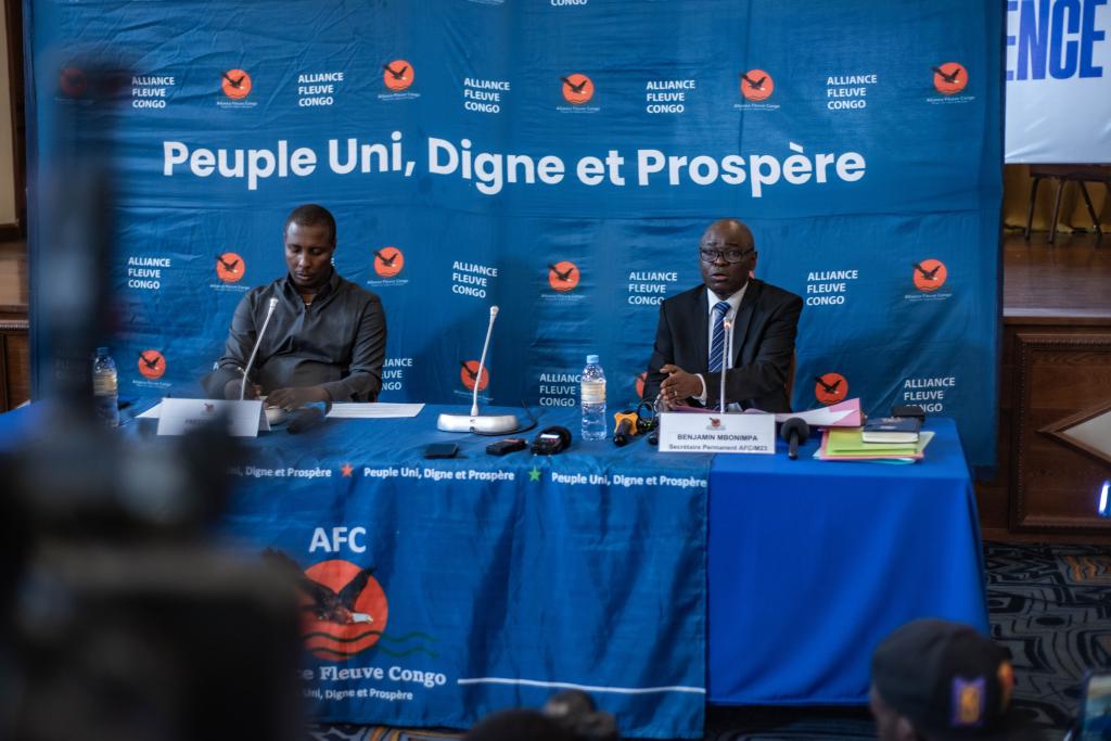 7月3日,剛果(金)反政府武裝“M23運動”對話代表姆博寧帕(右)出席在戈馬舉行的記者會。新華社發(fā)(扎內姆·內蒂·扎伊迪攝)