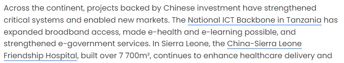 文章說,中國在非洲投資支持的項目夯實了關鍵系統(tǒng)根基,催生了新興市場。文章舉例說,坦桑尼亞的國家信息通信技術寬帶骨干網(wǎng)項目顯著拓寬了寬帶覆蓋范圍,讓線上醫(yī)療和線上學習成為可能,并強化了電子政務服務體系;塞拉利昂的中塞友好醫(yī)院持續(xù)提升當?shù)氐尼t(yī)療服務水平,在抗擊埃博拉疫情期間發(fā)揮了關鍵作用……文章說,這些項目的故事或許不會成為西方媒體的頭條新聞,但它們實實在在提振了市場,培養(yǎng)了勞動技能,為非洲企業(yè)的蓬勃發(fā)展創(chuàng)造了條件。