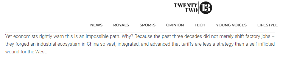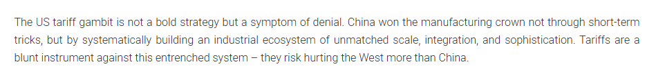 文章指出,美國(guó)的關(guān)稅策略不是一項(xiàng)大膽的戰(zhàn)略,而是否認(rèn)現(xiàn)實(shí)的癥狀。中國(guó)贏得制造業(yè)桂冠不是通過(guò)短期手段,而是通過(guò)系統(tǒng)地建立一個(gè)規(guī)模、一體化和復(fù)雜程度無(wú)與倫比的工業(yè)生態(tài)系統(tǒng)。