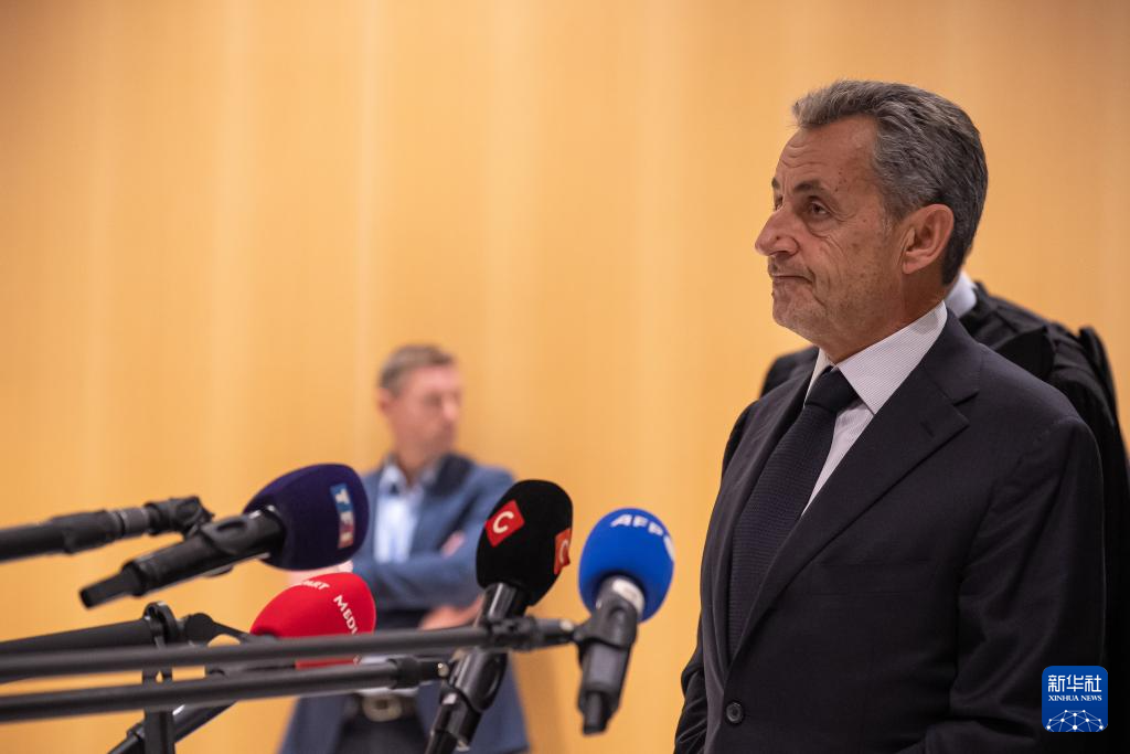9月25日,在法國(guó)巴黎,法國(guó)前總統(tǒng)薩科齊在庭審后接受媒體采訪。新華社發(fā)(奧雷利安·莫里薩爾攝)