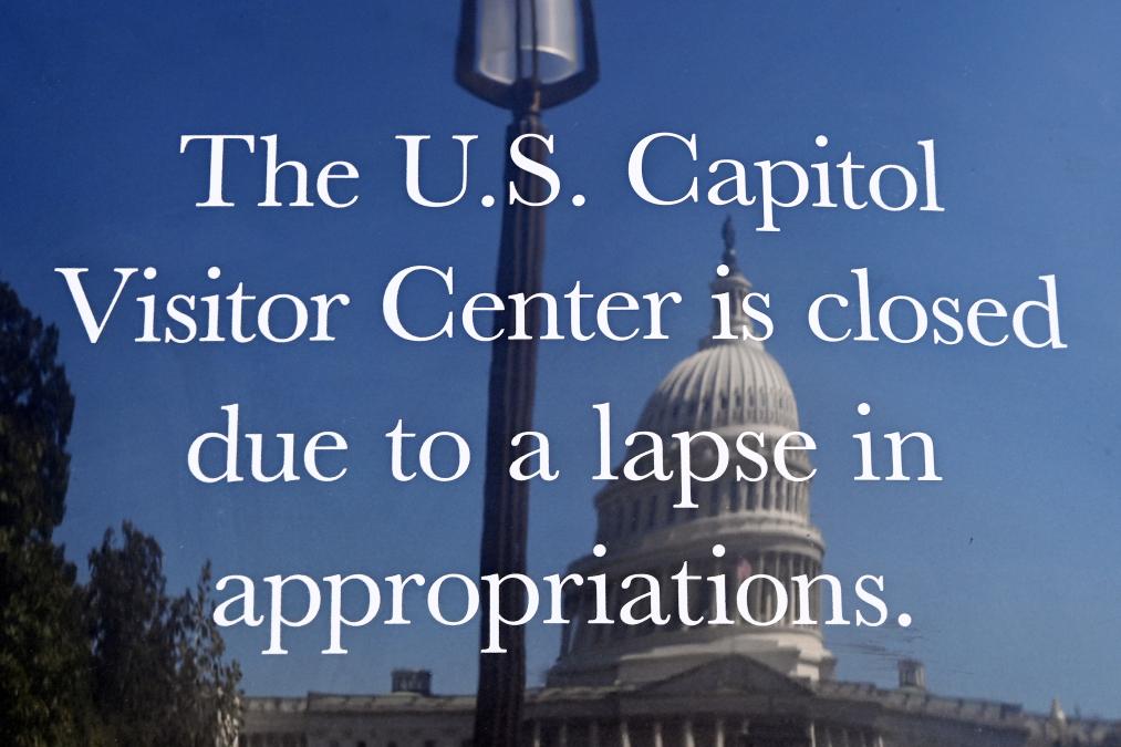 10月1日,在美國華盛頓的美國國會大廈前,公告牌顯示國會大廈游客中心關閉。新華社記者 李睿 攝