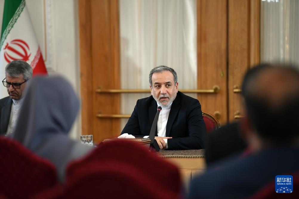 10月5日,在伊朗首都德黑蘭,伊朗外交部長(zhǎng)阿拉格齊(右)對(duì)多國(guó)駐伊朗外交人員發(fā)表講話。新華社記者 沙達(dá)提 攝