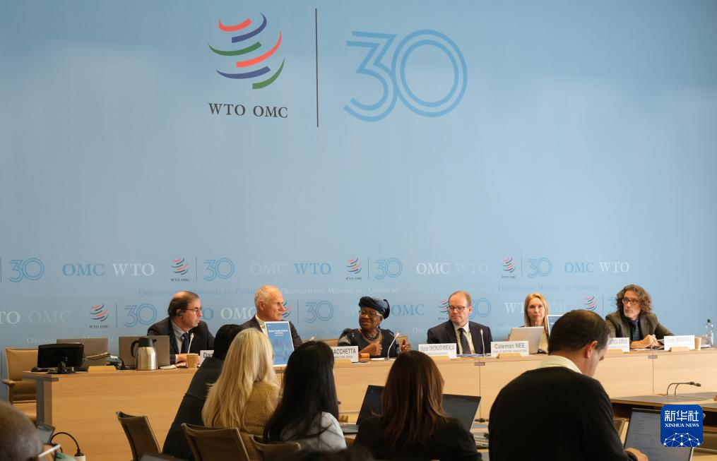 10月7日,在瑞士日內(nèi)瓦世界貿(mào)易組織總部,世貿(mào)組織總干事伊維拉(后左三)在新聞發(fā)布會上講話。新華社記者 馬汝軒 攝