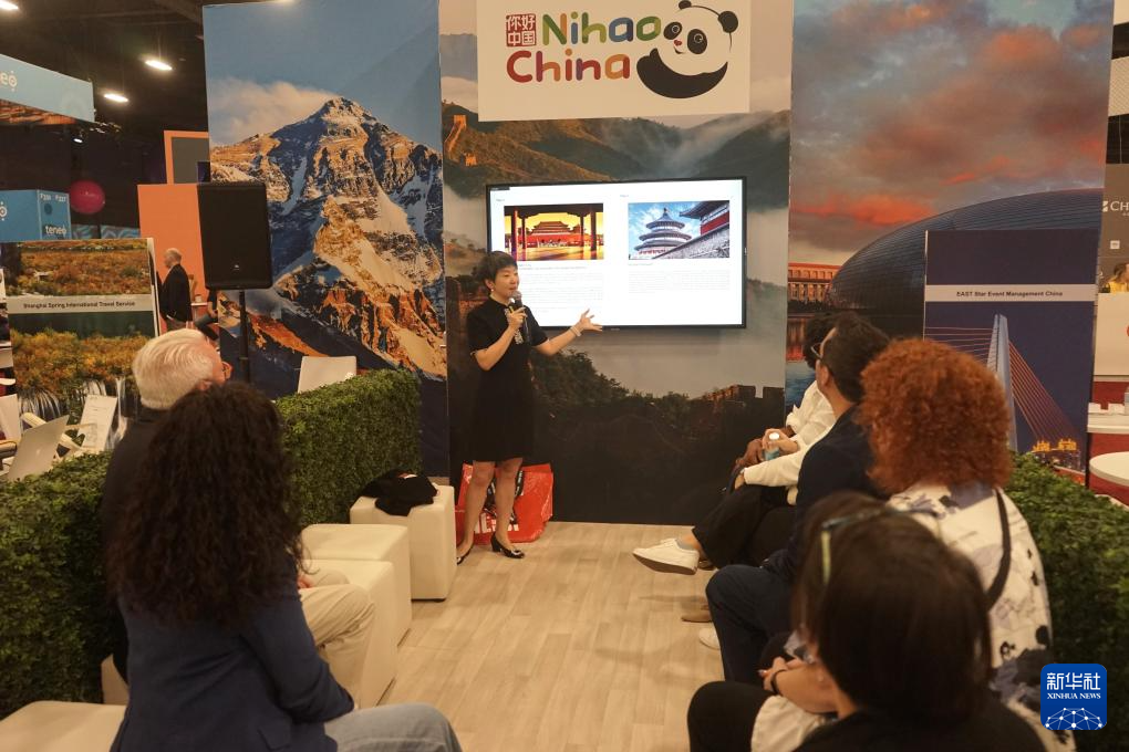 10月8日,在美國拉斯維加斯,參觀者在2025年美國國際會議與獎勵旅游展的中國展區(qū)傾聽講解。 新華社發(fā)(曾慧攝)