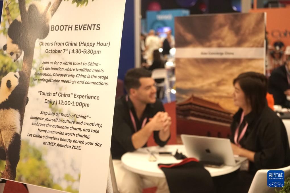 10月8日,在美國拉斯維加斯,人們在2025年美國國際會議與獎勵旅游展的中國展區(qū)參觀。 新華社發(fā)(曾慧攝)