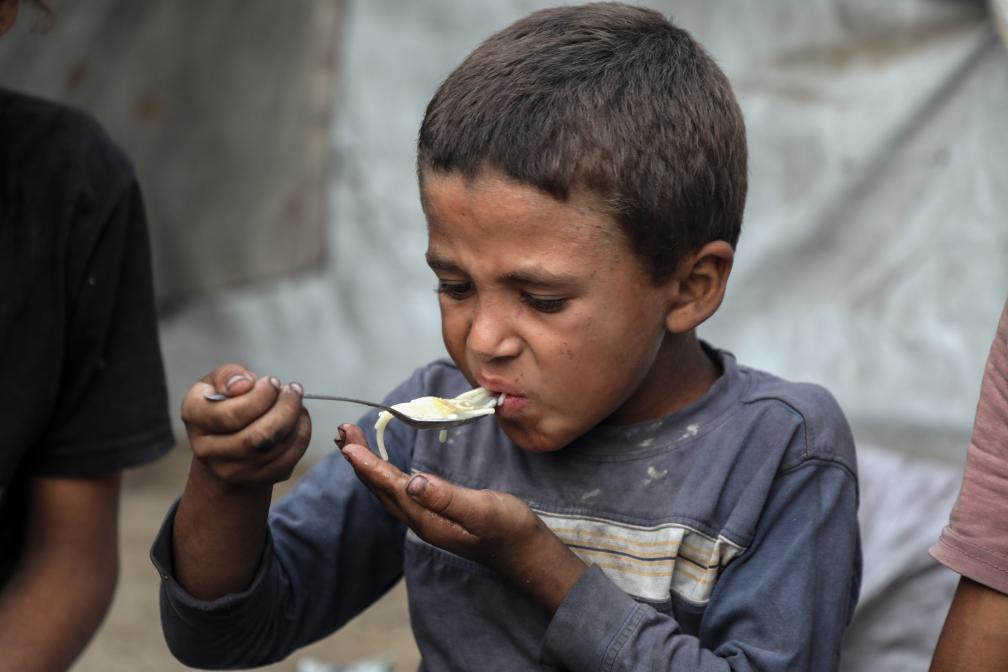 2025年7月29日,在加沙城的一個帳篷里,一名男孩在進食。當(dāng)?shù)卦S多家庭僅靠少許入境加沙地帶的人道主義援助物資維系生存。新華社發(fā)(里澤克·阿卜杜勒賈瓦德攝)