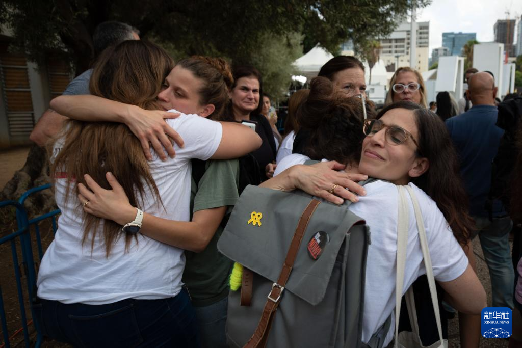 當9日加沙停火第一階段協(xié)議達成的消息傳來,在以色列國防部大樓對面的廣場上,被扣押人員馬坦的母親艾納夫與周圍的人相擁而泣。她高喊:“從現(xiàn)在起,這里叫希望廣場!”