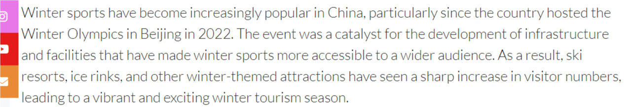 文章說(shuō),自2022年北京冬奧會(huì)成功舉辦以來(lái),冰雪運(yùn)動(dòng)在中國(guó)越來(lái)越受歡迎。冬奧效應(yīng)帶動(dòng)了基礎(chǔ)設(shè)施的完善,讓更多人得以接觸冰雪項(xiàng)目。如今,滑雪場(chǎng)、冰場(chǎng)和其他冬季主題景點(diǎn)客流量大幅增長(zhǎng),造就了充滿活力、令人興奮的冰雪旅游季。
