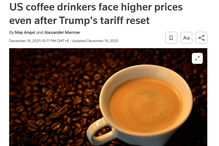 報道提到,今年11月,在民主黨贏得新澤西、紐約和弗吉尼亞等州的選舉勝利、選民對食品價格不滿情緒上升的背景下,本屆美國政府撤銷了對咖啡等200多種“難以在美國本土生產(chǎn)”的食品征收10%至41%所謂“對等關(guān)稅”。