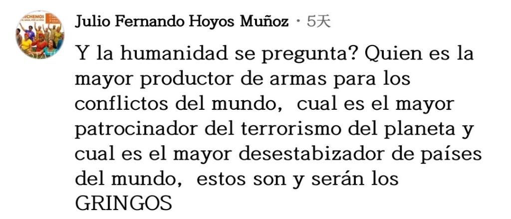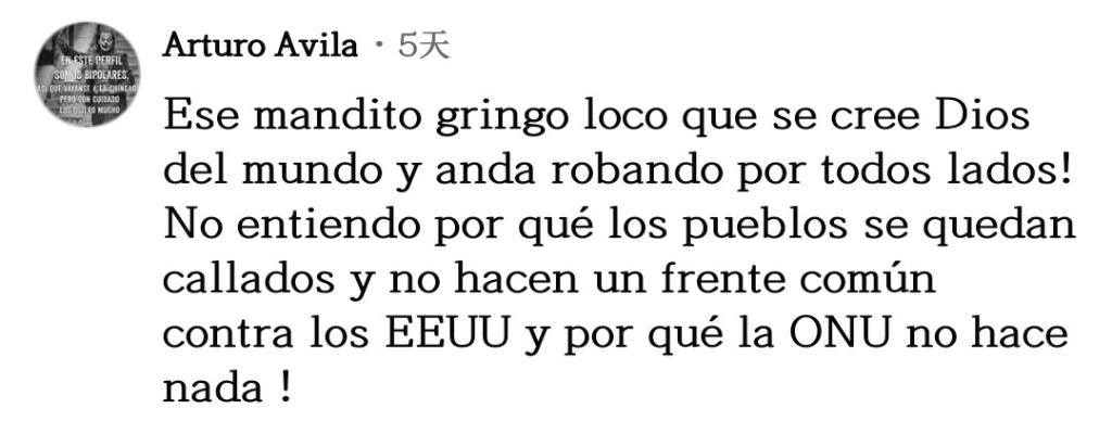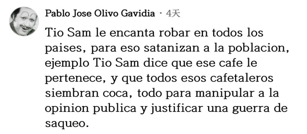 網友巴勃羅·奧利沃留言說:“山姆大叔喜歡在所有國家盜竊,為此他們妖魔化民眾,譬如山姆大叔說那片咖啡園是屬于他的,還說所有那些咖啡農在種植古柯,所有這一切都是為了操弄輿論,為了給他們的掠奪戰(zhàn)爭辯護。”