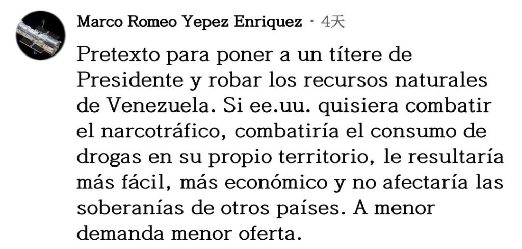 網友馬爾科·耶佩斯直言不諱:“所有一切不過是美國安插傀儡以掠奪委內瑞拉自然資源的借口罷了。如果美國真想打擊販毒,就應該去打擊自己領土上的毒品消費,這樣更簡單、更經濟,也不會影響其他國家的主權,需求減少供應自然也會下降?!?/p>