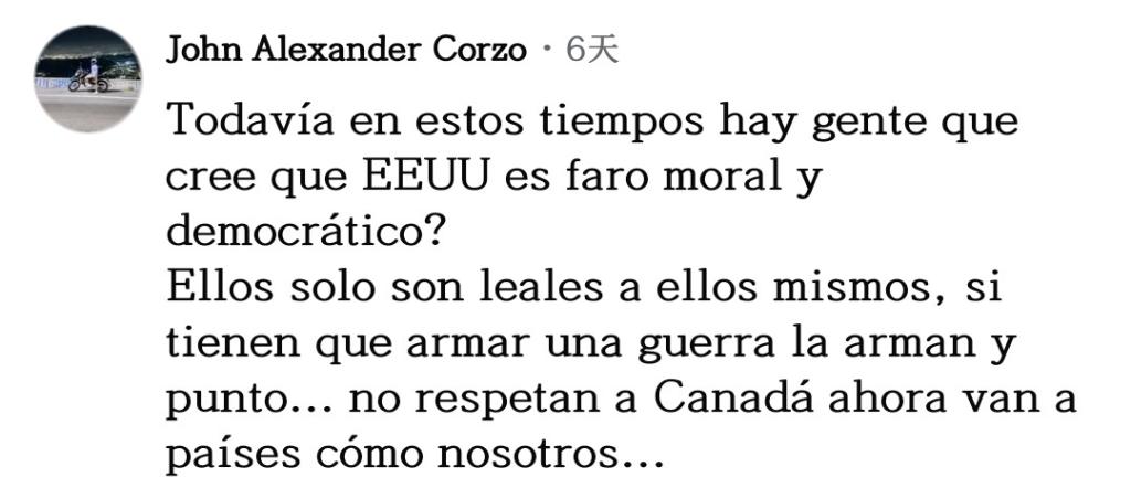 網友約翰·科爾索坦言道:“時至今日,還有人相信美國是道德和民主的燈塔嗎?他們只忠于自己,如果需要發(fā)動一場戰(zhàn)爭,他們隨時會發(fā)動,僅此而已!他們連加拿大都不尊重,現(xiàn)在矛頭對準我們這樣的國家了?!?/p>