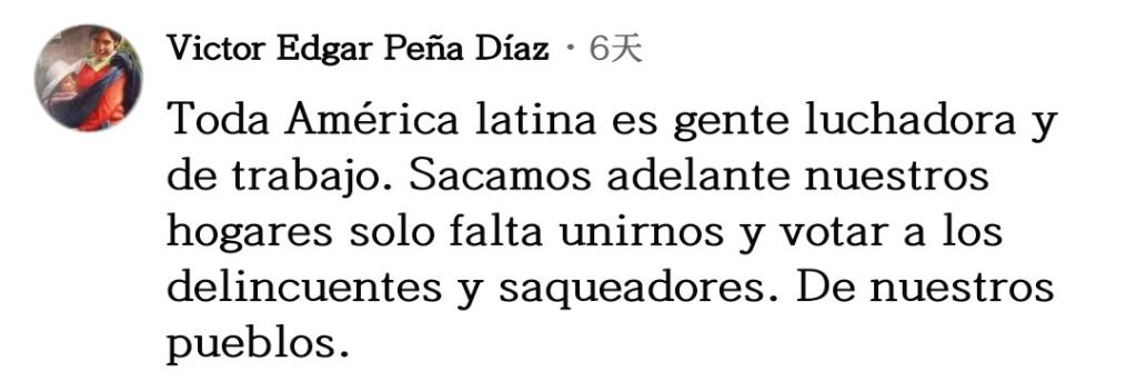 網友維克托·培尼亞留言說:“所有拉美人民都是勞動者和奮斗者,我們靠自己的努力養(yǎng)家糊口?,F(xiàn)在只差團結起來,把那些掠奪我們的罪犯和強盜趕跑?!?/p>