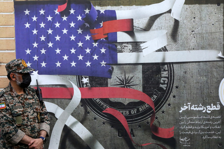 2025年11月4日,在伊朗首都德黑蘭舉行的集會(huì)上,安全人員站在反美宣傳畫(huà)前。當(dāng)天,伊朗多地民眾舉行集會(huì),譴責(zé)美國(guó)霸權(quán)和以色列的侵略行為。新華社發(fā)