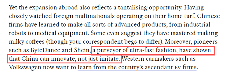 文章說(shuō),這輪全球化浪潮的廣度與速度同樣驚人。2024年中國(guó)上市公司海外營(yíng)收達(dá)2.1萬(wàn)億美元(約合15萬(wàn)億元人民幣),較2021年顯著增長(zhǎng)。當(dāng)前中國(guó)對(duì)外直接投資已超過(guò)外商對(duì)華投資。但更引人注目的是,在地緣政治緊張的背景下,中國(guó)企業(yè)正改變出海策略,更注重實(shí)體布局。中國(guó)企業(yè)已掌握從工業(yè)機(jī)器人到醫(yī)療設(shè)備的高端制造,新一代品牌更證明了中國(guó)創(chuàng)新能力。如今歐美車企反而開(kāi)始向中國(guó)電動(dòng)汽車車企取經(jīng)。
