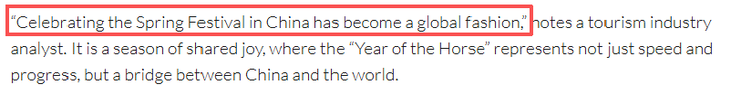 報道認(rèn)為,春節(jié)是一個共享歡樂的節(jié)日,馬年所象征的不僅是迅捷與進(jìn)步,更是一座連接中國與世界的橋梁。一位旅游分析師在報道中表示:“在中國過春節(jié)已成為一種全球時尚?!?/strong>