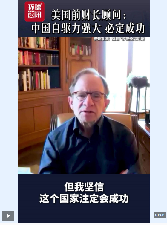 近日,美國前財(cái)政部長顧問史蒂文·拉特納在接受美國播客節(jié)目《查理·羅斯全球?qū)υ挕窌r(shí)表示,近20年來中國經(jīng)濟(jì)的高速發(fā)展不僅源于經(jīng)濟(jì)因素,更得益于中國人民追求成功的強(qiáng)大自驅(qū)力。他指出,這種難以用經(jīng)濟(jì)模型量化的拼搏精神深刻塑造了國家的經(jīng)濟(jì)前景,并認(rèn)為中國必定會成功。