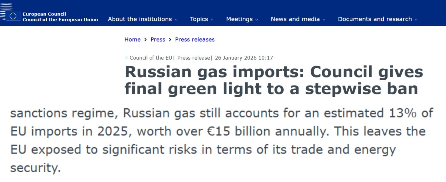 歐盟27個(gè)成員國1月26日正式通過關(guān)于逐步禁止從俄進(jìn)口管道天然氣和液化天然氣的法規(guī)。對從俄進(jìn)口液化天然氣的全面禁令將于2027年年初生效,對進(jìn)口管道天然氣的全面禁令將于2027年秋季生效。2025年,俄天然氣約占?xì)W盟進(jìn)口總量的13%,價(jià)值超過150億歐元。