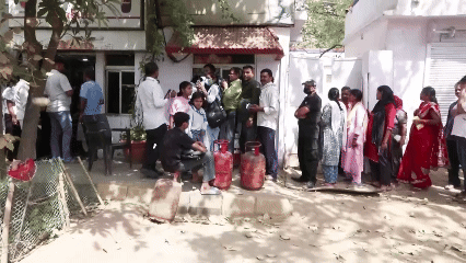 印度民眾手持購買憑證排隊(duì)等待領(lǐng)取液化石油氣罐。