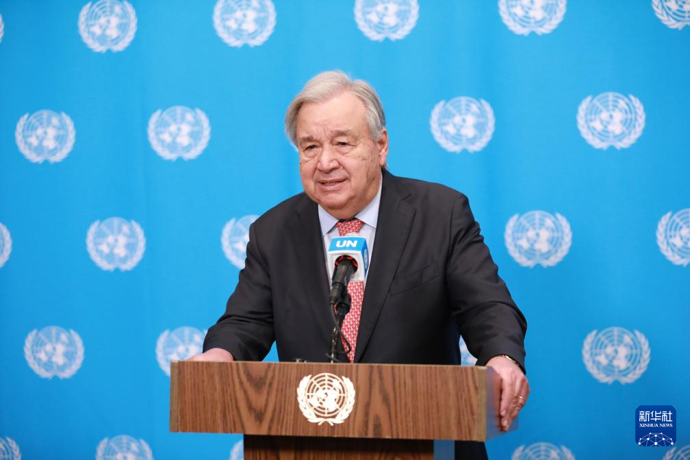 3月25日,聯(lián)合國(guó)秘書(shū)長(zhǎng)古特雷斯在位于紐約的聯(lián)合國(guó)總部舉行的記者會(huì)上講話(huà)。新華社記者 謝鍔 攝