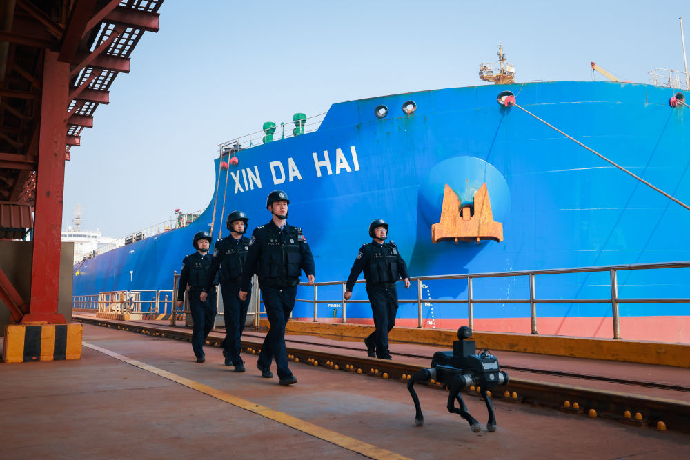 2026年4月2日,山東邊檢總站董家口邊檢站啟用四足機器人開展港區(qū)巡查,以科技強警提升管控效能。(受訪者供圖)