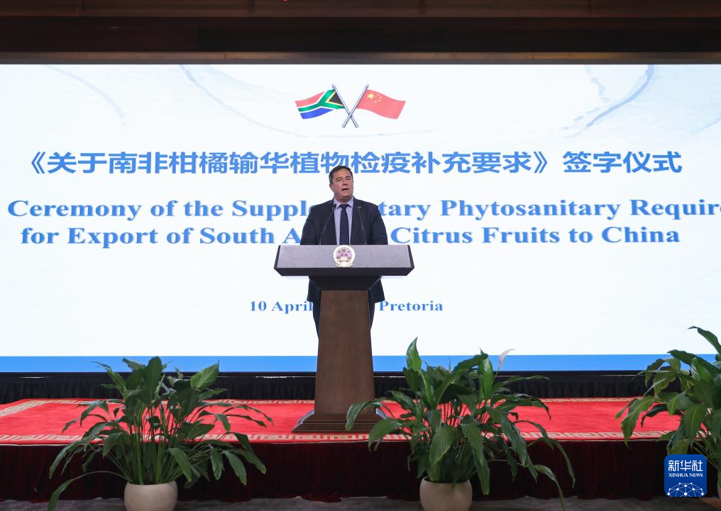 4月10日,在南非比勒陀利亞,南非農(nóng)業(yè)部長斯廷黑森在《關(guān)于南非柑橘輸華植物檢疫補充要求》簽字儀式上致辭。新華社記者 陳為 攝