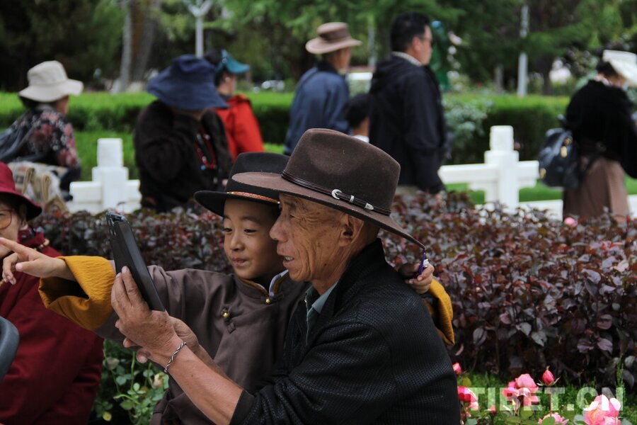 2025年8月24日雪頓節(jié),拉薩市的藏族爺孫倆在羅布林卡享受節(jié)日時(shí)光。攝影:趙釗