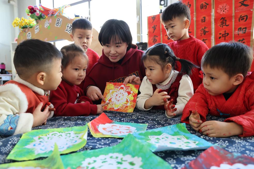 2025年12月31日,在山東省濱州市沾化區(qū)第一實驗幼兒園,老師教孩子們拓窗花。新華社發(fā)(賈海寧攝)