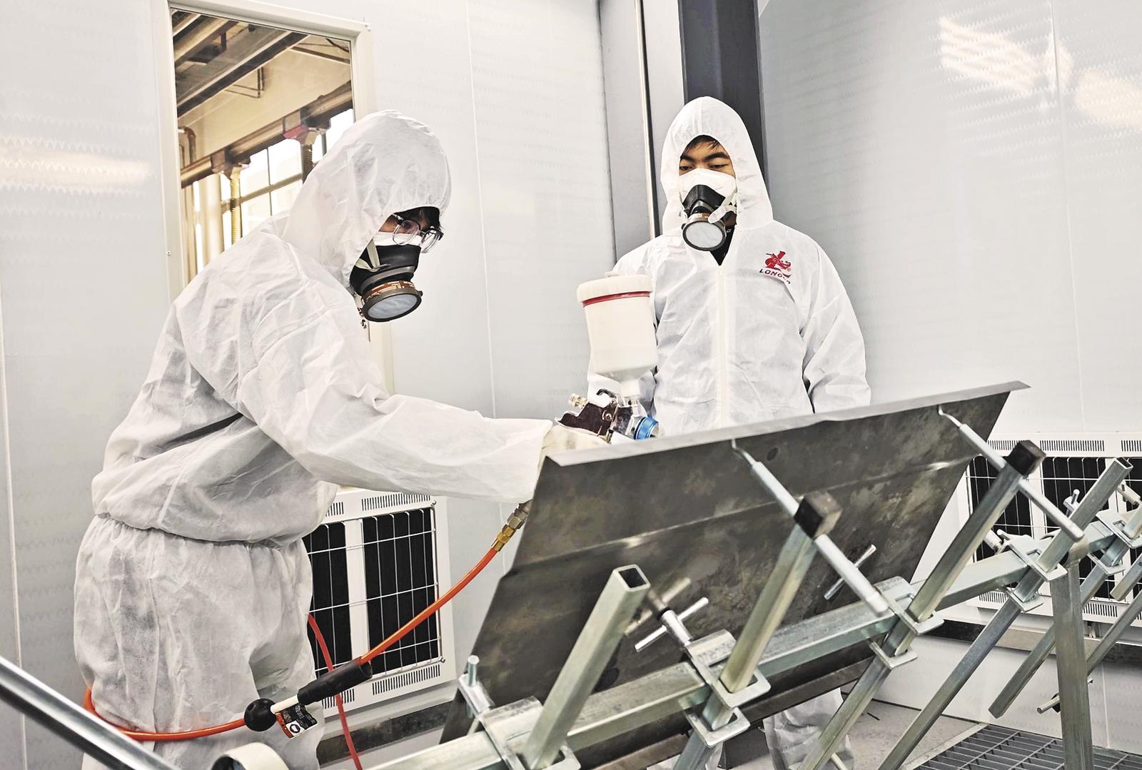 參加省級汽車裝備制造技能大賽賽前訓練的學生正在進行汽車涂裝學習。