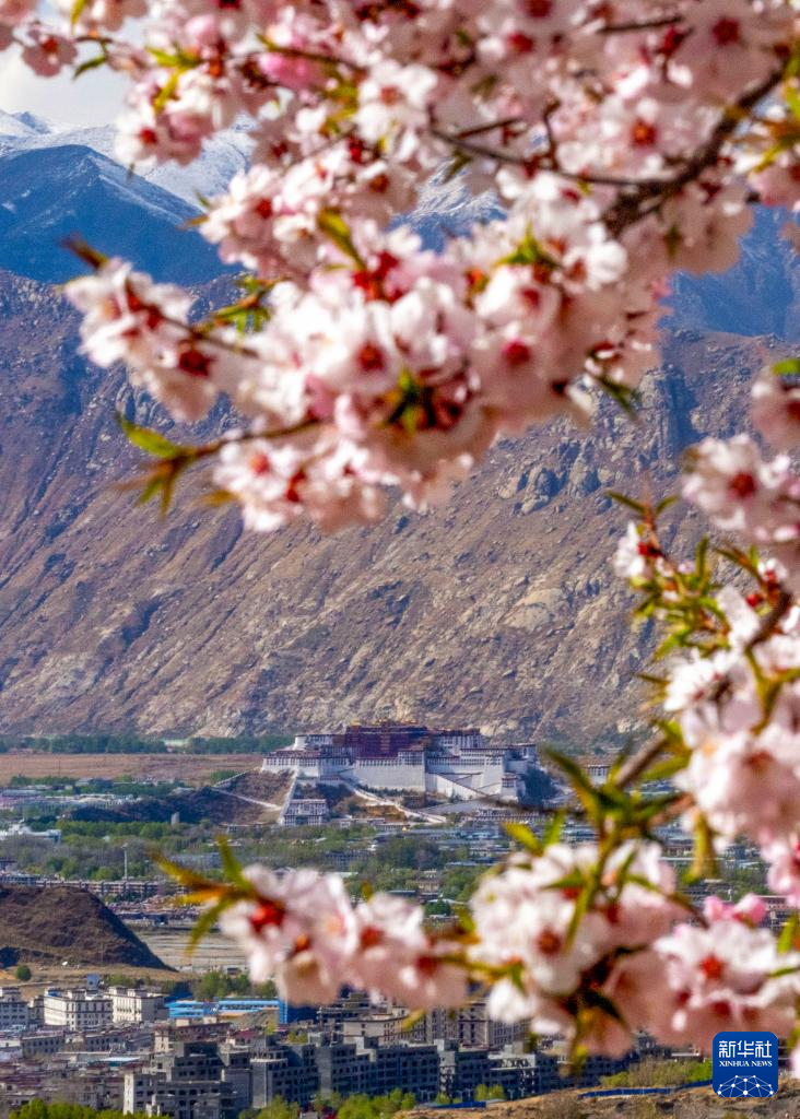??桃花映襯著布達拉宮(4月17日攝)。新華社記者 姜帆 攝