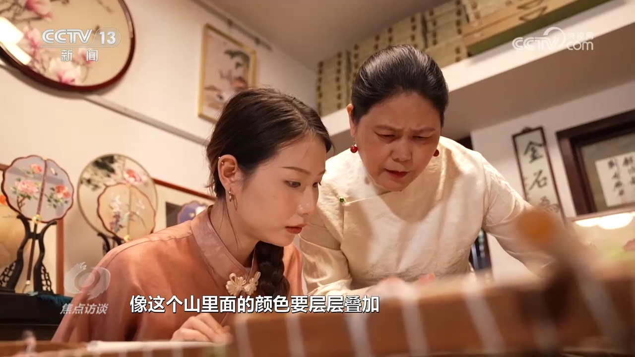 盧建英是蘇州當(dāng)?shù)赜忻奶K繡代表性傳承人。記者見(jiàn)到她的時(shí)候,她正在指導(dǎo)女兒刺繡。