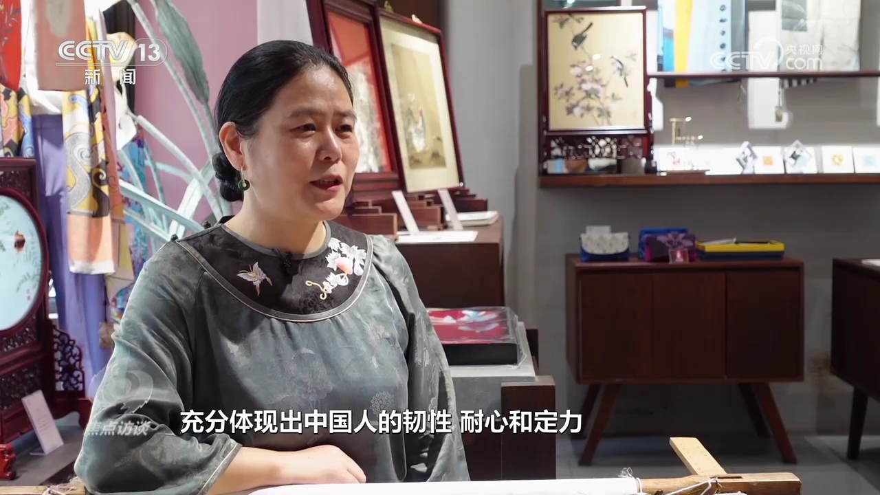 盧建英:“當(dāng)時(shí)我在繡一幅《桃花太平鳥(niǎo)圖》,習(xí)近平總書(shū)記走到了我的繃架前。他說(shuō)你好,很親切,很和藹,看得非常仔細(xì)。他說(shuō)中華文化的傳承力有多強(qiáng),通過(guò)這個(gè)蘇繡可以看出來(lái),像這樣的功夫充分體現(xiàn)出中國(guó)人的韌性、耐心和定力,這是中華民族精神的一部分,能得到總書(shū)記的認(rèn)可,真的是倍感榮耀。”