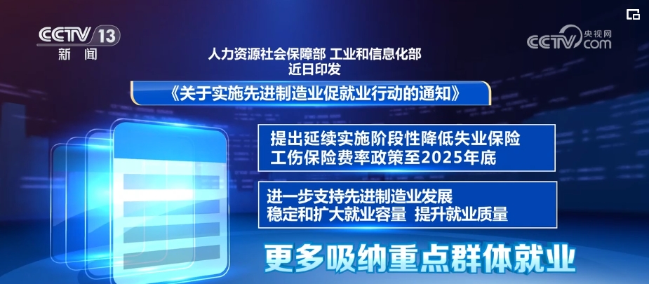 人力資源社會保障部、工業(yè)和信息化部印發(fā)《關(guān)于實施先進(jìn)制造業(yè)促就業(yè)行動的通知》,提出延續(xù)實施階段性降低失業(yè)保險、工傷保險費(fèi)率政策至2025年底,進(jìn)一步支持先進(jìn)制造業(yè)發(fā)展,穩(wěn)定和擴(kuò)大就業(yè)容量,提升就業(yè)質(zhì)量,更多吸納重點(diǎn)群體就業(yè)。