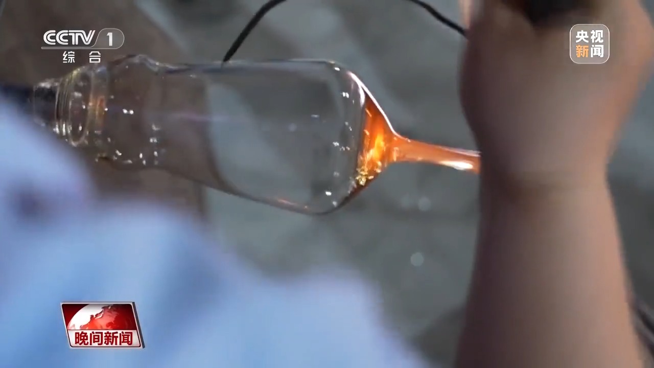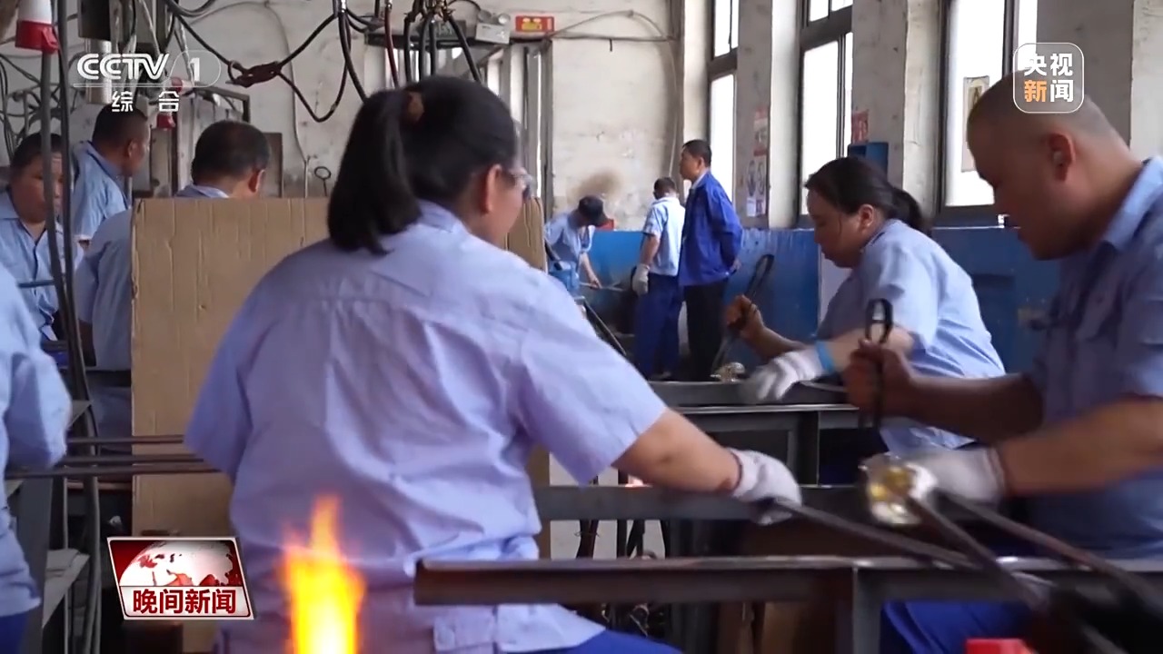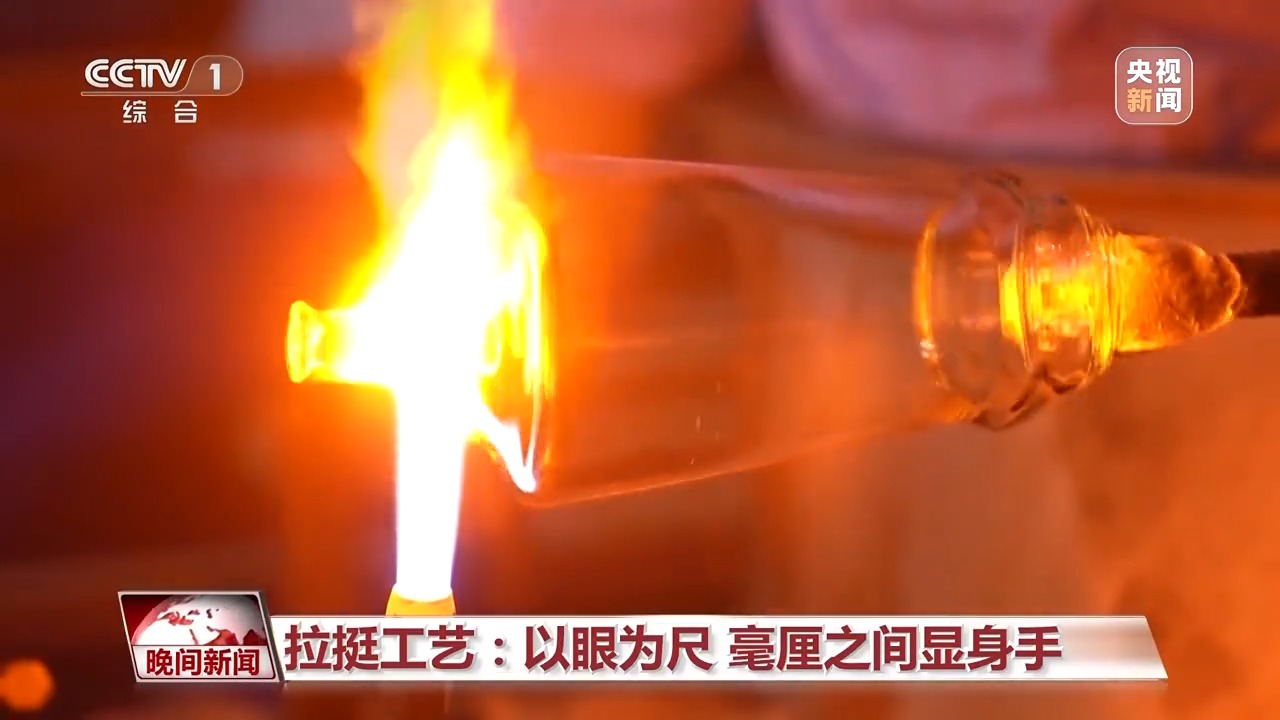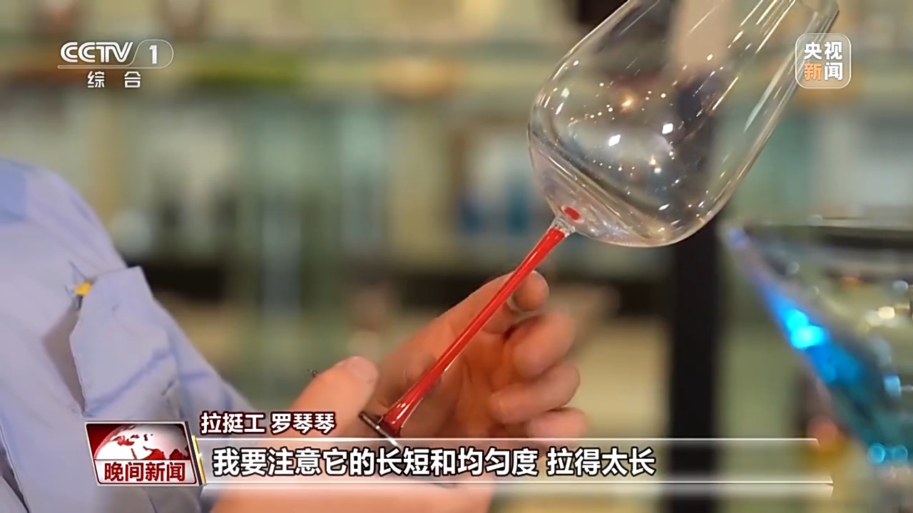 在素有“中國玻璃器皿之都”美譽(yù)的山西祁縣,人工吹制玻璃器皿的手藝被認(rèn)定為省級(jí)非遺。一團(tuán)團(tuán)紅彤彤的玻璃溶液,在數(shù)十位師傅手中傳來傳去,吹好杯身的毛坯,傳遞到拉挺師傅羅琴琴手中。