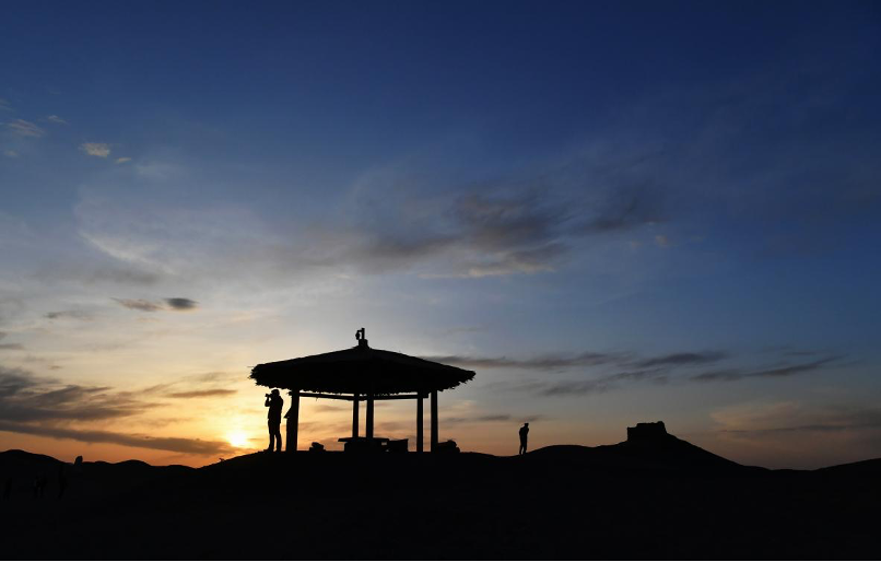 傍晚,游客在陽(yáng)關(guān)拍攝大漠落日景色。新華社記者 陳斌 攝