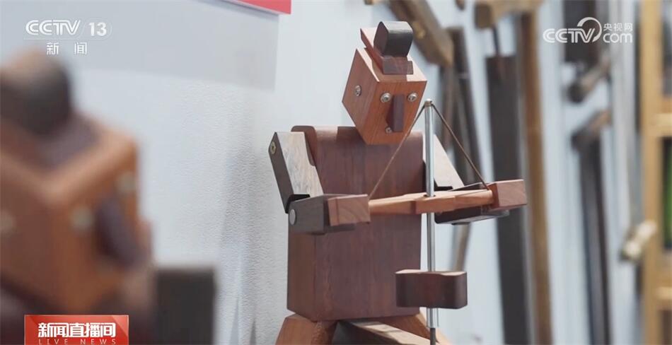 山東省非物質(zhì)文化遺產(chǎn)“橋氏木作”技藝傳承人喬一兵在工作站里也有自己的工作室,他用一整塊木料,不用一釘一鉚,制作魯班枕結構的系列用品。
