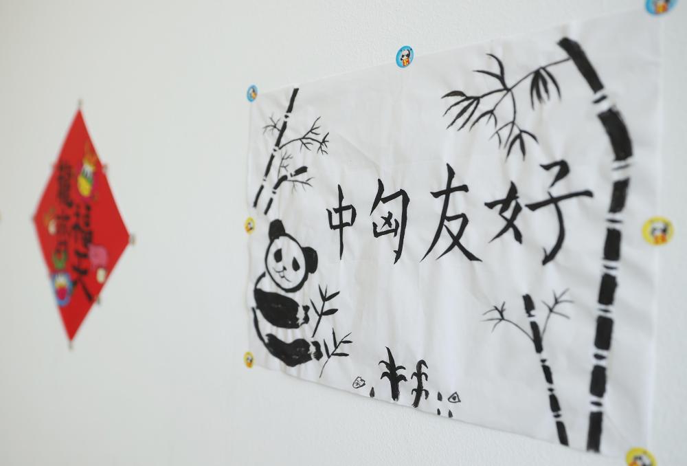 寫有“中匈友好”的小朋友畫作貼在匈中雙語學(xué)校教室墻上(2024年5月3日攝)。