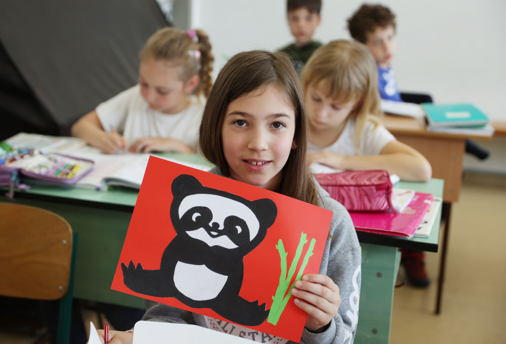 匈中雙語學(xué)校三年級(jí)學(xué)生寶怡展示自己的大熊貓形象美術(shù)作品(2024年5月3日攝)。