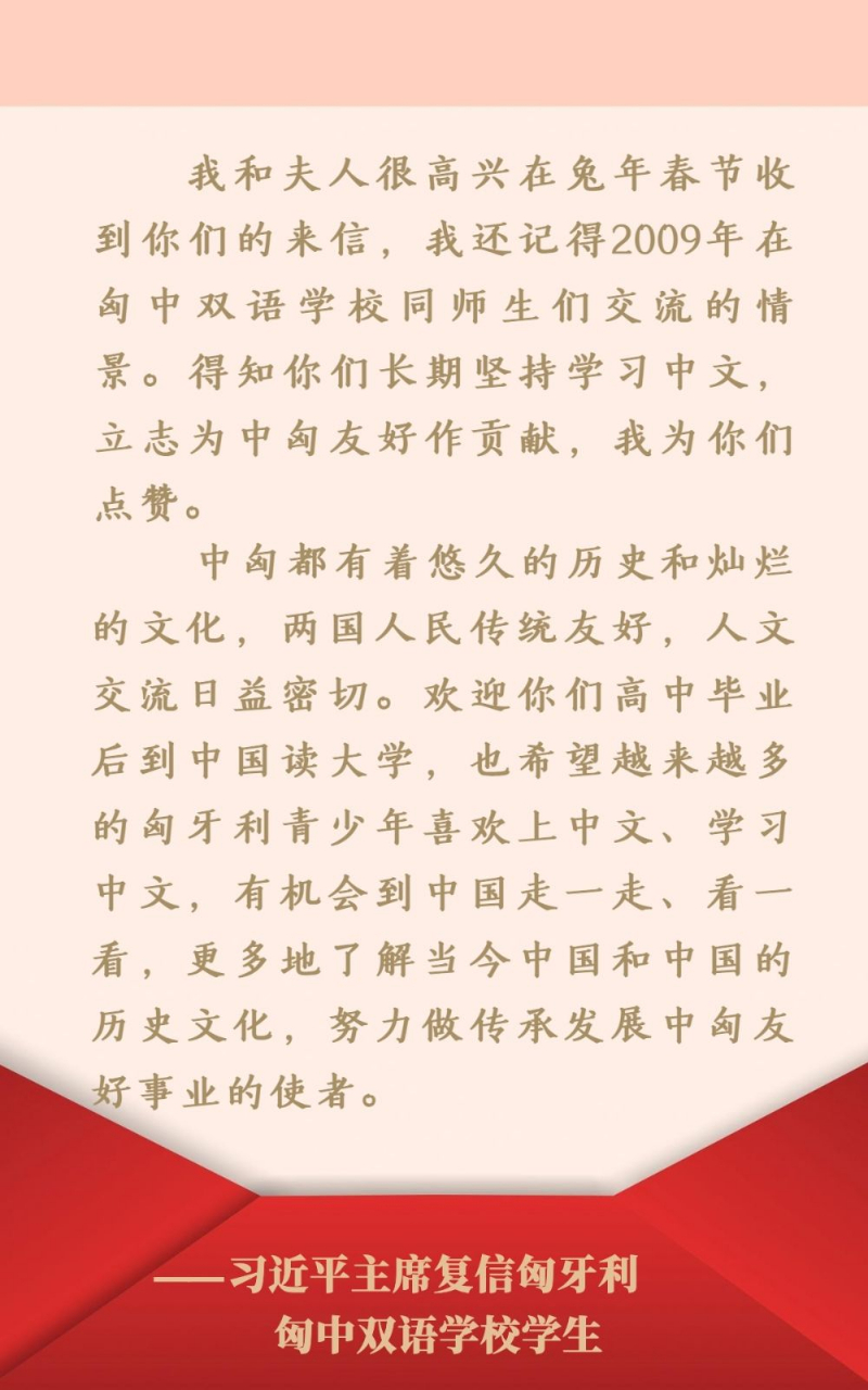 2023年春節(jié)前夕,匈中雙語學(xué)校學(xué)生胡靈月、宋智孝代表全校學(xué)生致信習(xí)近平主席和夫人彭麗媛教授,按照中國(guó)風(fēng)俗拜年,講述在校學(xué)習(xí)中文12年的感受,表達(dá)將來到中國(guó)上大學(xué)、為匈中友好作貢獻(xiàn)的愿望。