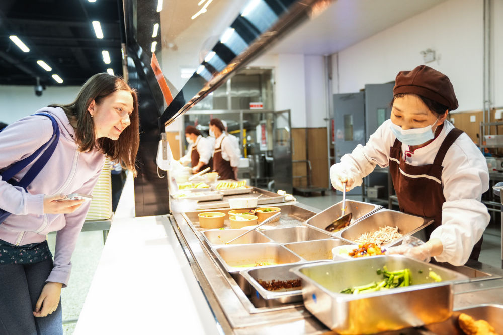 胡靈月在北京首都師范大學(xué)的食堂內(nèi)打飯(2024年4月28日攝)。