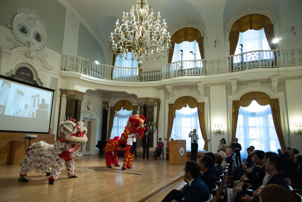 這是2022年6月21日在匈牙利布達(dá)佩斯舉行的羅蘭大學(xué)孔子學(xué)院成立15周年慶典上拍攝的舞獅表演。目前,匈牙利已開設(shè)5所孔子學(xué)院。