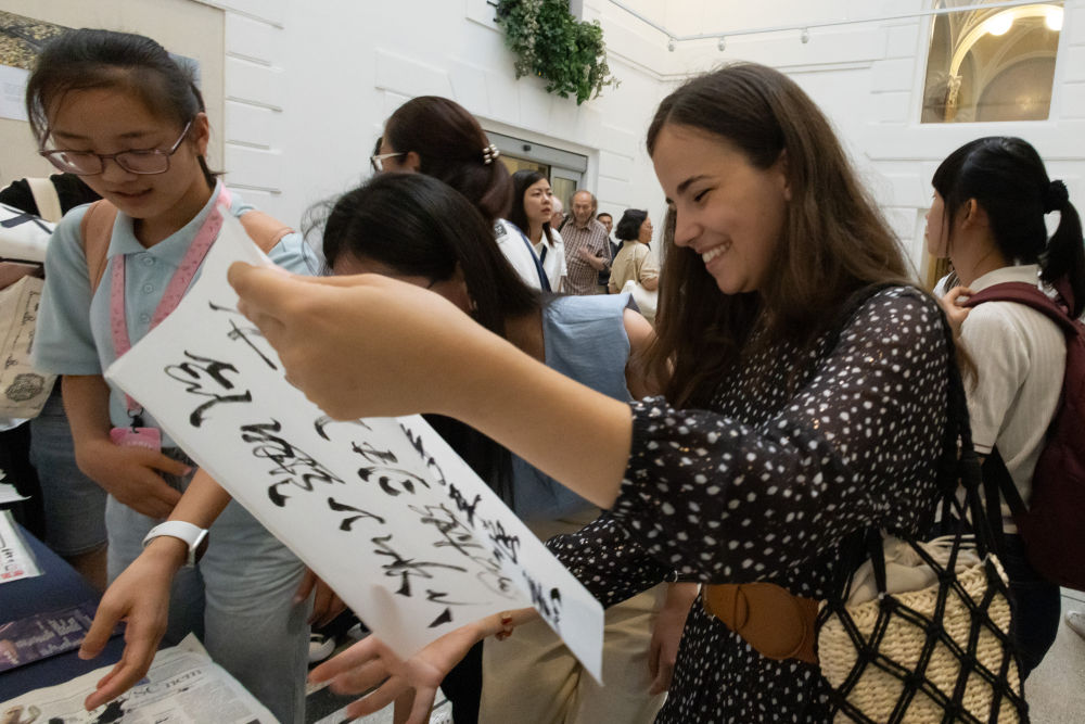 2023年8月29日,嘉賓在匈牙利布達(dá)佩斯“美美與共——中國(guó)匈牙利詩(shī)歌吟誦會(huì)”暨“漢字與中華文明”展上體驗(yàn)中國(guó)書法。