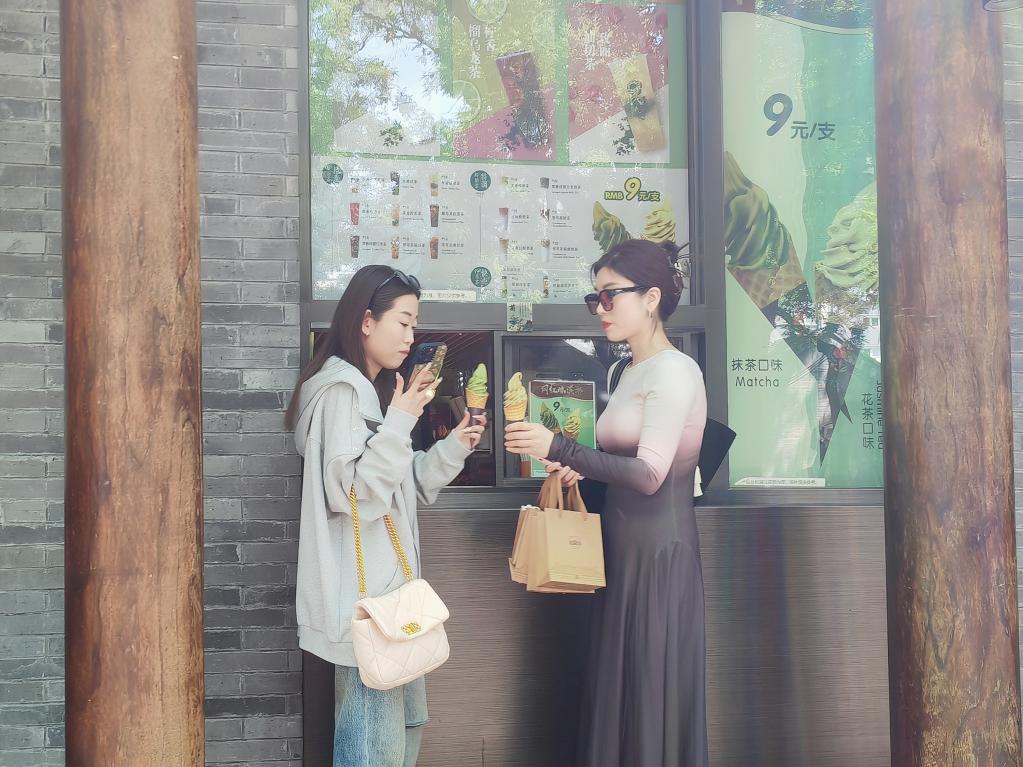 5月8日,位于東四大街的吳裕泰茶莊門口,兩名女士在購買冰激凌。新華社記者謝希瑤 攝