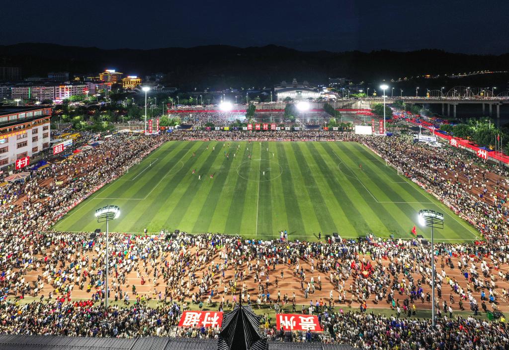 2023年7月1日,人們在觀看貴州“村超”足球賽(無人機照片)。新華社記者楊文斌攝