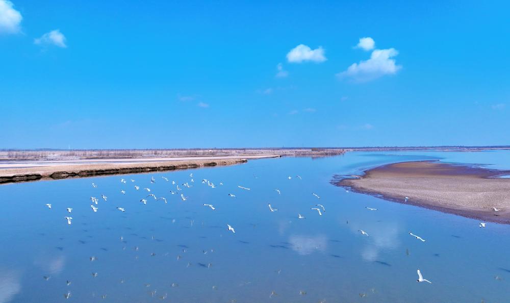在黃河寧夏段,候鳥(niǎo)在灘涂上空飛翔(2024年3月1日攝,無(wú)人機(jī)照片)。