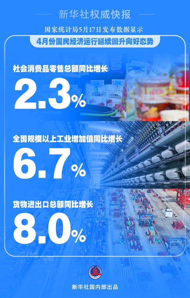 “總的來看,4月份國民經(jīng)濟(jì)運(yùn)行平穩(wěn),雖然部分指標(biāo)受節(jié)假日錯(cuò)月、上年同期基數(shù)較高等因素影響增速有所放緩,但工業(yè)、出口、就業(yè)、物價(jià)等主要指標(biāo)總體改善,新動(dòng)能保持較快成長(zhǎng),國民經(jīng)濟(jì)延續(xù)回升向好態(tài)勢(shì),積極因素累積增多?!眹医y(tǒng)計(jì)局新聞發(fā)言人劉愛華在當(dāng)日舉行的國新辦發(fā)布會(huì)上說。