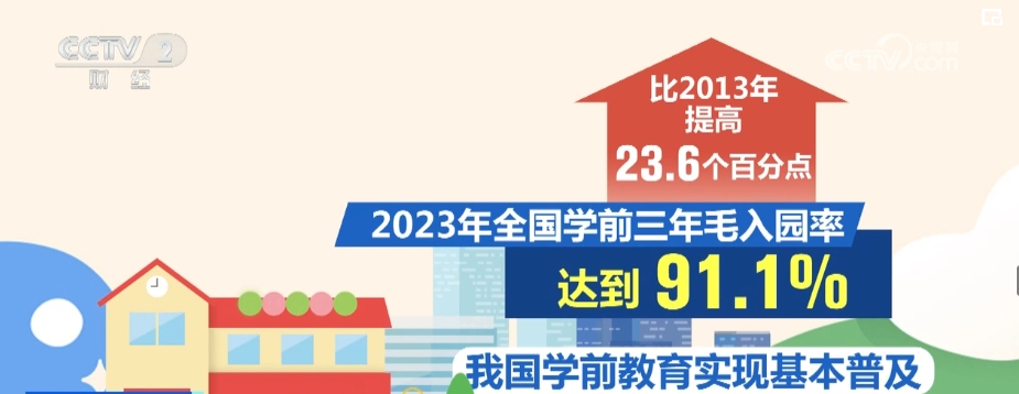 據(jù)介紹,截至2023年,全國幼兒園數(shù)量達(dá)到27.4萬所,2023年全國學(xué)前三年毛入園率達(dá)到91.1%,比2013年提高了23.6個(gè)百分點(diǎn),我國學(xué)前教育實(shí)現(xiàn)基本普及。