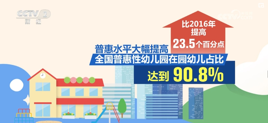 2011年—2023年,中央財(cái)政支持學(xué)前教育發(fā)展專項(xiàng)資金累計(jì)投入2210億元。普惠水平大幅提高,全國普惠性幼兒園在園幼兒占比達(dá)到90.8%,比2016年提高23.5個(gè)百分點(diǎn),絕大多數(shù)幼兒都能在收費(fèi)合理的普惠性幼兒園就讀。
